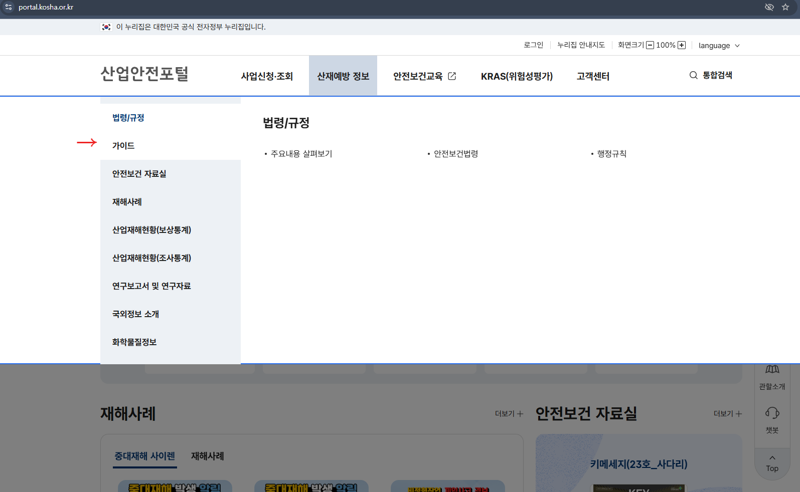 2. 산재예방 정보에서 "가이드"를 클릭합니다.